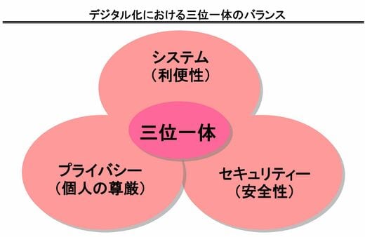総じて言えるのは、自治体システムのデジタル化においては、システム(利便性)、プライバシー(個人の尊厳)、セキュリティー(安全性)のバランスを取ることが求められる、ということです。基本的に、これらは矛盾した関係にあります。利便性を求めデータを提供すると、プライバシーがのぞかれる心配が生じますし、あるいはドコモ口座不正出金問題のようにセキュリティーが犠牲になることも。