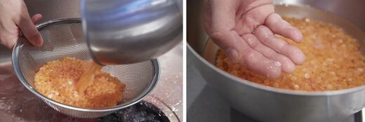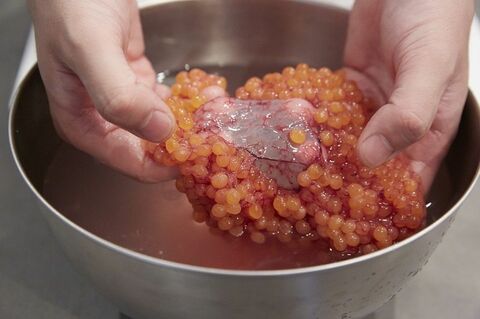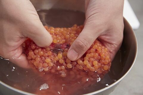 まず筋子をほぐします。ボウルに張った水の中で、筋子の膜の切れ目から指を入れ、卵が表にくるようにくるっと裏返すとほぐしやすくなります。水でほぐれない場合には、ぬるま湯に浸してもOK。親指の腹で膜をしごきながら丁寧にほぐしましょう。