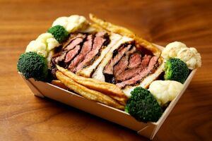 同店も緊急事態宣言の発令後、1カ月間休業。5月7日に営業を再開した時点では、ほとんど客が来なかったという。そこでテイクアウトを始めることにしたが、先行する店が多い中、個性を出すにはどうしたらいいか考え抜いた末、たどり着いたのがボリューム感満点のステーキサンドだった。沈んだ雰囲気の中、ボリュームに驚く客が思わず笑顔になり、食べておいしいと満足する商品を出したいとの考えからだった。