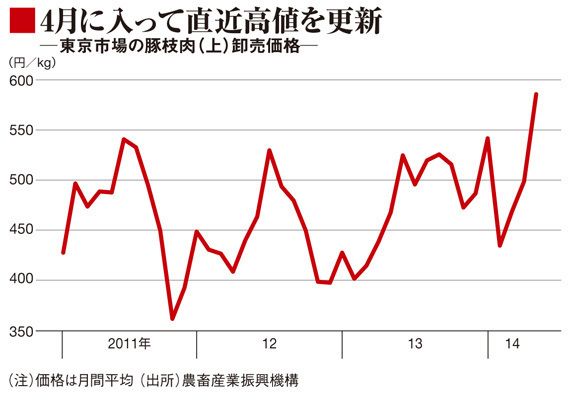 とはいえ、PEDの拡大以前から、相場が上昇しやすい素地はあった。「PEDによる死亡は日本の豚飼養頭数の約1%にすぎない。高騰のそもそもの原因は、2012年度後半から続く豚肉在庫の低水準だ」と、農林水産省食肉鶏卵課の担当者は指摘する。