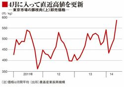 東京市場の豚枝肉(半身、上)卸売価格は4月、一時1キログラム当たり727円まで上昇し、17年ぶりの高値に。月間平均でも586円まで上がった。引き金となったのが、豚流行性下痢(PED)の流行だ。