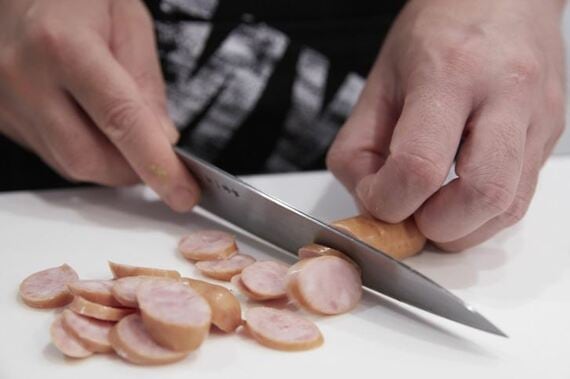 ソーセージは斜め薄切りに切っておきます(写真:LEON編集部)