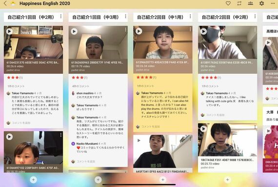 こうした刺激を与えながら、「学び方」も教えていく。「Weblioというサイトがあるよ」「教科書にこんなページがあるよ」と、単語の調べ方などを教えるほか、音読動画や教科書の解説動画を自作して掲示板ソフトのPadletにアップし、生徒がそれらを活用して自主的に学べるようにした。「『自分で学んでね』と指示だけして、最後に音読や自己紹介を撮影した動画を提出させるような授業を中心に展開しました」(山本氏)。