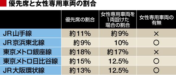 「婦人専用車両」が導入された100年前とは異なり、今、女性と男性は、電車、職場、学校を共有しています。だからこそ、少なくとも優先席と同程度には、女性専用車両の必要性が認められるべきだと思うのです。下の表に見るように、実は量的にも、1編成の電車の総座席数に占める優先席の比率は、女性専用車両の座席数の比率とほぼ同じ。お年寄りに席を譲るのと同じ気持ちで、女性専用車両を認めるべきではないでしょうか。