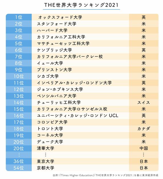 実際、英国の高等教育専門誌『Times Higher Education』「THE世界大学ランキング2021」を見てみると、トップ10にオックスフォード大学(英)、スタンフォード大学(米)、ハーバード大学(米)、カリフォルニア工科大学(米)、マサチューセッツ工科大学(米)など英米の大学がズラリと並び、日本の大学では36位に東京大学、54位に京都大学がランキングされるのみ。そのほか100位以内に日本の大学は見当たらない。