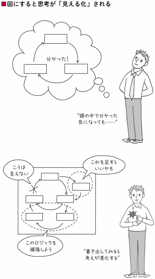 図を描いて考えることのメリットはたくさんあります。例えば、思考の「見える化」ができること。思考の「見える化」は、思考のモレや矛盾、弱点を明らかにしてくれます。