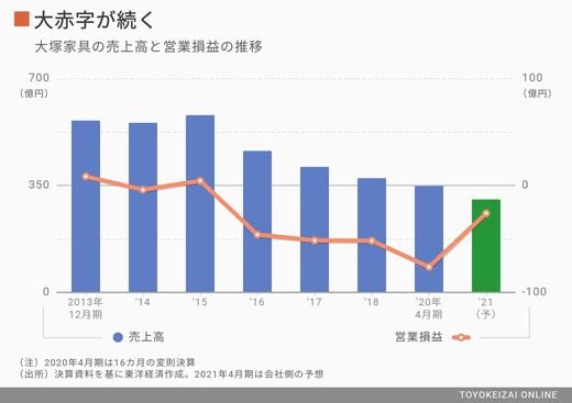が、その後はお家騒動によるブランドイメージの悪化や、商品構成の新鮮味の乏しさなどから顧客離れが深刻化。ニトリやイケアといった低価格SPA(製造小売業)の台頭も受け、2016年度から4期連続で営業大赤字に陥った。2017年の年末からは資金繰りが逼迫し、10社以上のスポンサー交渉に明け暮れる。そして2019年12月、家電と家具のセット提案を強化していたヤマダが同社株式を51%取得した。