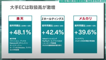 これ(画像タイトル「大手ECは取扱高が激増」)が4~6月の取扱高なんですけれども、前年同期と比べて大きく伸びたというのがあります。