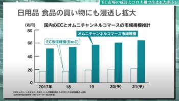 これ(画像タイトル「日用品 食品の買い物にも浸透し拡大」)はコロナ前の統計になるんですけども、EC市場がずっと伸びてきていて、オムニチャネルという形で店舗と融合したような、何らかネットが関わって消費がされているものというのもずっと伸びてきています。