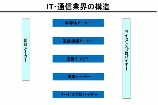 上流から下流へと半導体メーカー、通信機器メーカー、通信キャリア、携帯メーカー、サービス・プロバイダーが階層をなし、部品メーカーとライセンスプロバイダーがそれぞれに部品とライセンスを提供しています。