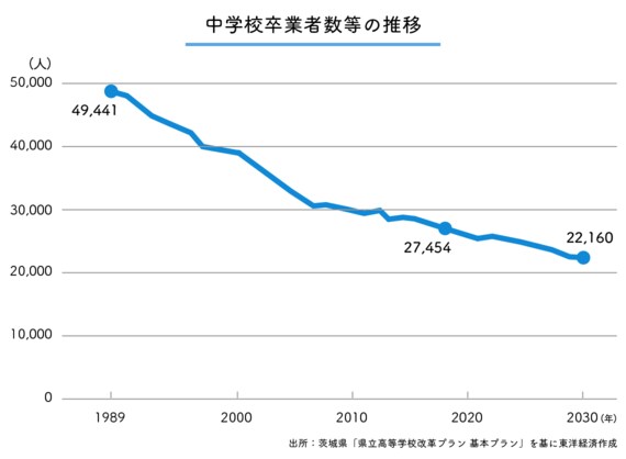 その理由の1つに少子化がある。これは日本全体に言えることだが、茨城県では中学校卒業者数等は1989年の4万9441人をピークに年々減少し、2018年に2万7454人になり、30年には約2万2000人まで激減すると見込まれている。これにより地域振興、そしてそれを担う人財育成において重要な役割を果たす高等学校の小規模化が進むことから、茨城県では「県立高等学校改革プラン」を策定。学校の再編等も含めた多様で魅力ある学校、学科づくりに努めている。