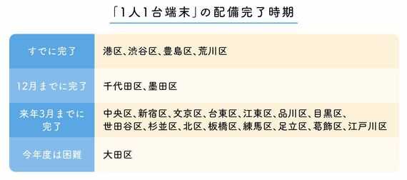 この中で配備が「12月までに完了」としたのは千代田区と墨田区、「来年3月までに完了」が中央区、新宿区、文京区、台東区、江東区、品川区、目黒区、世田谷区、杉並区、北区、板橋区、練馬区、足立区、葛飾区、江戸川区の15区だ。「今年度は困難」と答えた大田区は、すでに新規調達機器で小学校の配備は完了しているものの、小学校に配備していた既存機器を回収後、設定を変更して中学校に配備予定のため、最終的な区内全体の配備完了は21年6月になる見込みという。