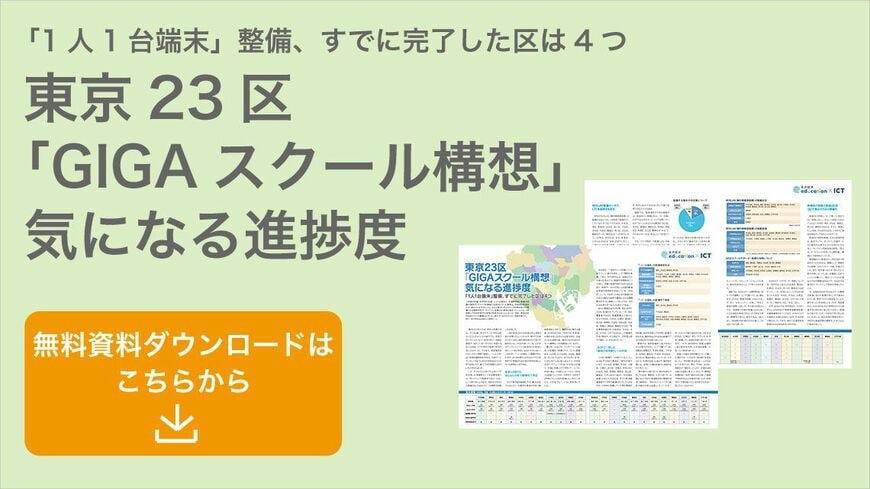 ここでは紹介しきれなかった調査結果の詳細をPDFにまとめた。配備完了前に休校となった場合の対応やGIGAスクールサポーター制度の活用意向、教員研修の実施状況とその内容、またそれぞれの区が「1人1台端末」の配備と併せて導入を検討しているソフトウェアなども紹介している。各区の基本情報も掲載しているので、学校数や児童・生徒数など規模を見比べながら読み解くことができ、印刷して保存版とすることも可能だ。