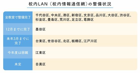 学校の校内LAN(構内情報通信網)の整備状況はどうか。「全教室で整備完了」しているのは13区で千代田区、中央区、港区、新宿区、文京区、品川区、大田区、渋谷区、杉並区、豊島区、荒川区、足立区、葛飾区だった。墨田区は「12月までに完了」、台東区、世田谷区、北区、板橋区、江戸川区の5区は「来年3月までに完了」、江東区は「今年度は困難」、目黒区は「未定」だった。