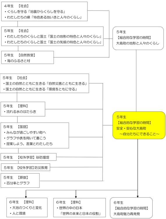 私が相談を受けている学校ですが、伊豆大島にある大島町立つばき小学校の学習指導案がすばらしい。以下は5年生の学習全体の系統性を示したもので、教科を横断するだけでなく、4年生と6年生の学びとのつながりも考えられています。