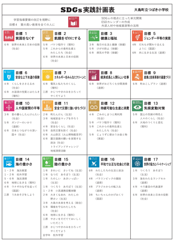 手島氏が開発したツール「SDGs実践計画表」も活用し、全学年の学習内容とSDGsの関連性も可視化(提供:大島町立つばき小学校)