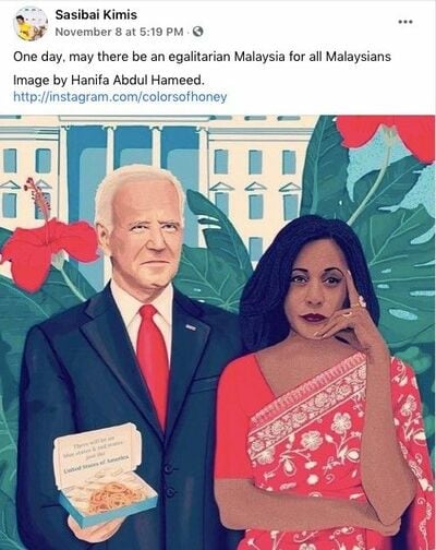 首都クアラルンプールで、マレーシアの先住民らが天然の素材を使って丹念に作ったバッグなどを売るショップを経営する社会起業家、サシバイ・キミスさん(41歳)もその1人だ。ハリス氏当選が確実となったその日に、サシバイさんはFacebook上でバイデン氏とハリス氏のツーショットが描かれたイラストをシェア。ハリス氏がインドの伝統的な真っ赤な衣装を身にまとい、インド人女性が好む大振りのゴールドのジュエリーを指にはめているこのイラストは、「今、“カレースパイス”はたいそう誇らしげだろう」などのコメントとともに、マレーシアのインド系女性たちの間で広く拡散された。