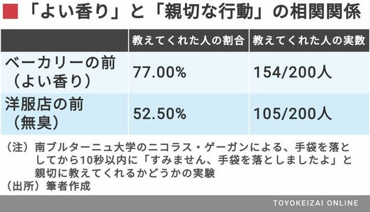 手袋を落としてから10秒以内に、「すみません、手袋を落としましたよ」と親切に教えてくれるかどうかを測定してみたのである。ただし、手袋を落とす実験の場所は、2つ準備していた。1つは、よい香りが周囲に漂っているベーカリーの前。もう1つは、まったく無臭の洋服店の前だ。