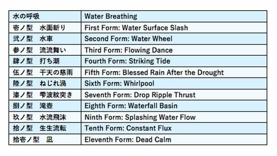 それぞれの呼吸には「型」と呼ばれる技が複数存在しています。呼吸によってその数は異なるのですが、番号が振られ、名前がつけられています。今回は、炭治郎や冨岡義勇の使う「水の呼吸」の型を取り上げてみましょう。ほかの呼吸の型が英語でどのように訳されているのか興味のある方は、ぜひ英語版のコミックにチャレンジしてみてください!