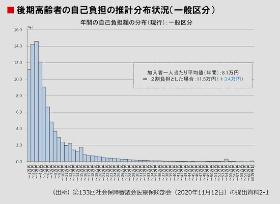 これは、後期高齢者の自己負担の推計分布状況である。加入者1人当たり平均(年間)自己負担額は8.1万円である。ここで仮に2割負担とした場合、年3.4万円増の11.5万円となる。自己負担率が1割から2割になると負担が2倍になるのは、自己負担額が低い人たちであり、大きなリスクを抱えた医療費が高くなる重病の人たちは2倍にはならない。