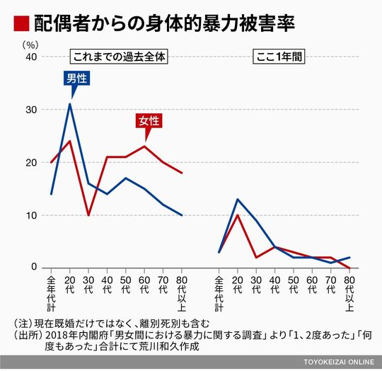 対象は、現在有配偶者だけではなく、離別死別の過去既婚経験のある人たち20代から80代以上に対して、相手から身体的暴力を受けた経験があるかどうかを調査したものです。「1、2度あった」「何度もあった」合計にて男女別年代別に被害経験を表したのが以下のグラフとなります。比較のために「これまでの過去全体」と「ここ1年間」の被害率を並べています。