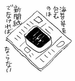 一口食べ、二口食べ、さてこのへんで、と、史実にのっとって包んであった新聞をガサゴソ広げて読み始める。