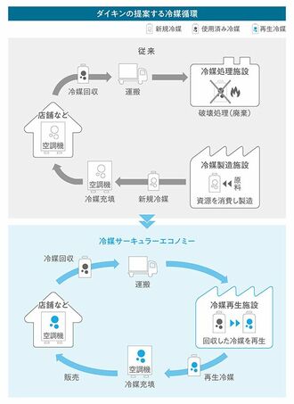 このジレンマを解決するため、ダイキンが取り組んだのが冷媒の再生利用だ。冷媒の寿命が半永久的であることに着目したのである。