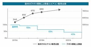 「空気を冷やしたり暖めたりするエアコンの機能は、室内機と室外機を結ぶ配管の中を循環している『冷媒』というガスによって担われています。従来エアコンに使われていたHCFC冷媒は、オゾン層を破壊する性質があることから、欧州では世界の先進国に先駆けて2010年に新規の供給が中止され、オゾン層を破壊しないHFC冷媒に代替されました。しかし、HFC冷媒にも温室効果があるため、欧州では地球温暖化防止の観点から、いわゆる『Fガス規制』によって管理されてきました。この規制はとくに2015年から強化され、HFC冷媒の製造も輸入による調達も強く制限されることになり、HFC冷媒の総量がCO2換算量で段階的に削減されています」
