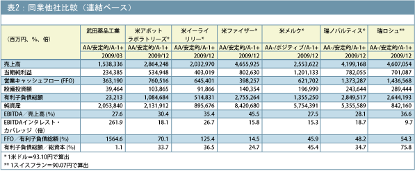 こうした半面、財務負担を抑えた大型買収により製品パイプラインを拡充させて、信用力を高めた例もある。09年11月のメルク(AA−/ポジティブ/A−1)によるシェリングプラウ(格付けなし)の買収である。メルクは現金と株式交換を組み合わせた買収で財務負担を抑えた結果、シェリングプラウの充実したパイプラインからの寄与が見込まれることなどを受けて、スタンダード&プアーズは、格付けを据え置き、同社のアウトルックを「安定的」から「ポジティブ」へ上方修正した。