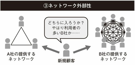 新規顧客は価値の大きいほう、すなわち既存顧客数が多いほうのネットワークに雪だるま式に加入していくのです。これにより後発企業は、構造的に追いつくのが困難になります。