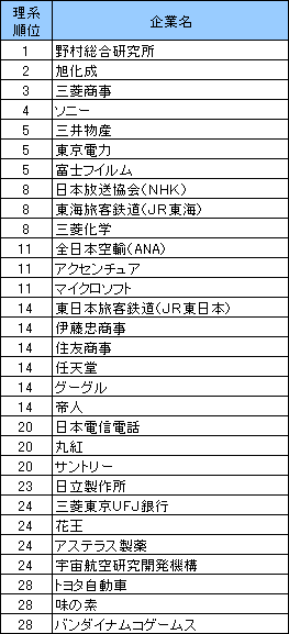 東京大学で人気1位に輝いたのは、野村総合研究所。志望業界では「シンクタンク・コンサルタント」は5位だったものの、志望企業としては集中した。投票した学生はほぼすべての学科系統にわたるものの、「情報・通信系」「建築・土木系」「物理・数学系」といった学科では特に人気があるようだ。「シンクタンク・コンサルタント」では、アクセンチュアも11位にランクインしている。今回実施した一連の大学別人気企業ランキングで、同社がトップ30位に顔を出すのは初めてだ。2位は旭化成。得票の3分の2は専攻分野がそのままつながる「化学系」からとなっているが、これまですべての大学においてトップ10をキープしている唯一の企業である。「化学」からは、富士フイルム(5位)、三菱化学(8位)もランクインしているが、いずれも「化学系」から得票の過半数を稼いでいる。3位には三菱商事、そのほか5位三井物産、14位伊藤忠商事と住友商事、20位丸紅と、大手商社5社がすべてランクインしたのが注目される。4位には常連のソニーが入るも、電機メーカーからは23位の日立製作所の2社のみという結果になった。「電気・電子系」の回答者比率が低かったことが響いたこともあるだろうが、他大学では人気の高かったパナソニックが47位と低迷した。8位には日本放送協会(NHK)が初めてトップ10入り。その他、東京大学のランキングで目を引くのは、11位のマイクロソフト、14位のグーグルといった外資系IT企業と、14位の任天堂、28位のバンダイナムコゲームスといったゲーム業界からのランクインであろう。また、24位の三菱東京UFJ銀行、宇宙航空研究開発機構なども他大学では上位に見られなかった企業である。