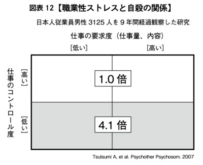 「仕事のコントロール度」だけで比較した別の研究では、「仕事のコントロール度」が高い人を1とすると、「仕事のコントロール度」が低い人のほうが、自殺が4.1倍も高いことがわかりました(図表12、日本人従業員男性3125人を9年間経過観察した研究:Tsutsumi A, et al. Psychother Psychosom.2007)。