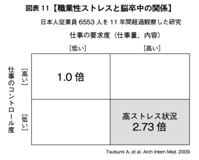 また、仕事のストレスが高いと脳卒中になりやすいという日本のデータもあります。ストレスがもっとも低い「要求度が低く、コントロール度が高い仕事」を1とすると、ストレスがもっとも高い「要求度が高く、コントロール度が低い仕事」は、脳卒中になるリスクが2.73倍も高くなるという研究結果が得られました(図表11、日本人従業員6553人を11年間経過観察した研究:Tsutsumi A,et al.Arch Intern Med.2009)。