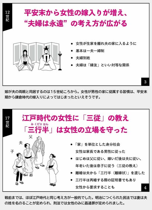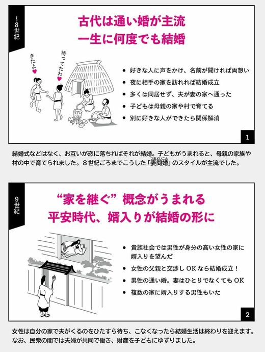 キャリア・教育 900年前の日本は夫婦別姓、時代ごとの結婚の形 日本の歴史と文化を「4コマ」で端的におさらい 2分で読める 公開日時:2020/12/29 09:30 小越 建典 ライター フォロー 中里 裕司 立正大学文学部非常勤講師 フォロー 1/3 PAGES INDEX テーマ1:結婚 テーマ2:お金 テーマ3:交通 日本の歴史と文化を4コマイラストでわかりやすくご紹介します(山川出版社提供) グローバル化が進む現代では、何気ない会話の中でも改めて日本について問われる機会が少なくありません。 ただ、「日本史を学び直したいけど大変そう」と言う人もいるでしょう。最新刊『4コマで日本史 日本をみなおす50の視点』では、さまざまな場面で話題になるようなテーマや日本特有のテーマなどが4コマイラストでわかりやすく紹介されています。 本稿では同書から一部を抜粋しお届けします。 テーマ1:結婚 現在まで、結婚や家族のあり方は時代によって変化してきました。日本では、かつてどのようなスタイルがあったのでしょうか? その変化をみていきます。 (出所:『4コマで日本史 日本をみなおす50の視点』) 次ページが続きます:【貨幣はどうやって統一された?】 2/3 PAGES 3/3 PAGES