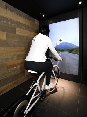 設置された自転車をこぐと前方の映像が森の中や海沿いなどに変化。それぞれのシーンに応じ、空気が温度・湿度・気流・香りまで瞬時に切り替わり、室内にいるのに臨場感たっぷりだ。