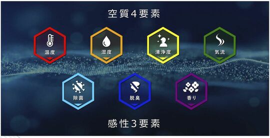 空気質に注目が集まる昨今、弊社はモノ起点の『機能』の提供ではなく、人起点の『価値』の提供にシフトをしていきたいと考えています。具体的には、『健康・快適・安全安心・集中・リラックス』を実現するために、『空質4要素(温度・湿度・清浄度・気流)』と『感性3要素(除菌・脱臭・香り)』に着目しました。この7要素をブレンドし、自在にコントロールすることで、さまざまな室内空間に価値の高い空気質を提供していきます」