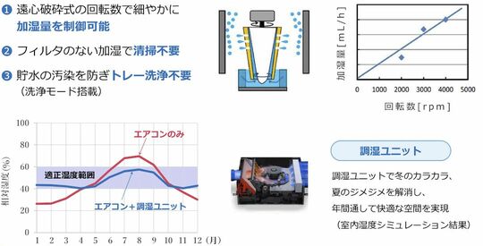 この「調湿ユニット」は、独自の「遠心破砕加湿技術」を使用している。高速回転するドラムから遠心方向に吹き出した水滴を壁面にぶつけることで微細化させ、空調で加熱された空気に含ませて加湿を可能にする仕組みだ。