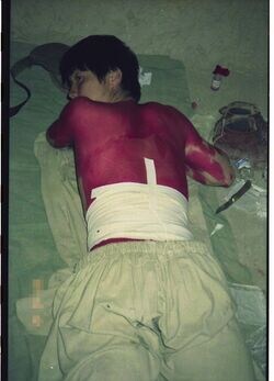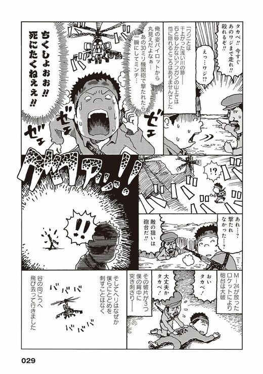 「ソ連製の攻撃ヘリが、砲台をロケットで攻撃しました。砲台は大破して、飛んできた小さい破片が3つ背中に刺さりました」