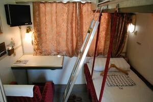 8位は現役サンライズの1人用A個室寝台。座席も備わるが、作業用チェアで座り心地は普通。幅の広い寝台に上体を起こして足を投げ出すこともでき、かなり快適だ。