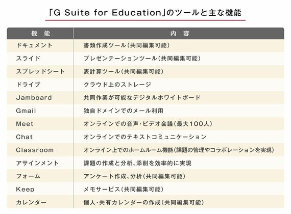 複数ある教育向けのクラウドパッケージの中で、シェアを伸ばしている「G Suite for Education」を見ると、機能はかなり充実している。かえってそのツールの多さにひるんでしまいそうだが、それほど難しいことはない。まずは「校務の作業負荷に利用すれば、その便利さを実感できるはず」と貝塚氏は先生方にエールを送る。