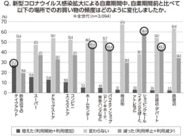 「テイクアウト」が増えた代わりに「減った」という回答が多かったのが「ホームセンター」45.6%、「バラエティショップ」43.4%、「ショッピングモール」58.9%、「百貨店・デパート」43.2%でした。
