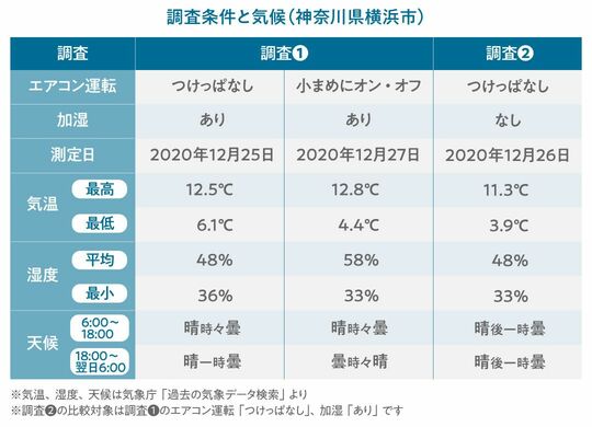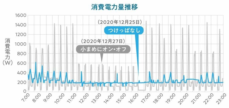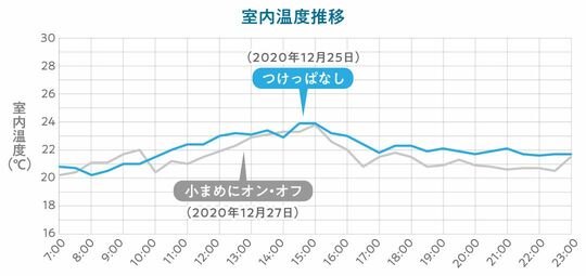 実際、エアコンをつけっぱなしのほうが室内温度は高めで推移していた。体感もオン・オフするよりは暖かく感じたという。