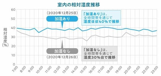 結果、「加湿なし」では室内相対湿度が25.5%〜36.9%の幅で推移し、湿度40%未満の時間帯が続くのに対し、「加湿あり」では34.7%〜40.6%で、快適とされる湿度40%の前後に保たれていた。