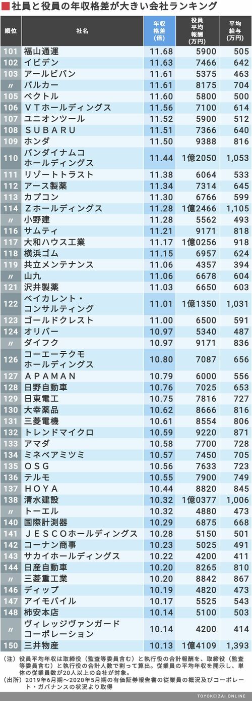 政治・経済・投資 #賃金・生涯給料ランキング 前の記事 次の記事 社員と役員の「年収格差」ランキングTOP500 平均に10倍以上の「格差」がある会社は158社 3分で読める 公開日時:2020/12/29 05:10 田中 久貴 東洋経済データ事業局 フォロー 1/11 PAGES 2/11 PAGES 3/11 PAGES 4/11 PAGES 次ページが続きます:【次に151〜200位】 5/11 PAGES 6/11 PAGES 7/11 PAGES 8/11 PAGES 9/11 PAGES 10/11 PAGES 11/11 PAGES
