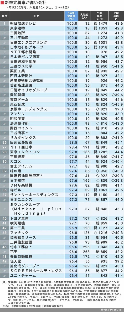 キャリア・教育 #就職四季報プラスワン 前の記事 次の記事 最新版「給料が高く新卒が辞めない会社」TOP200 平均年収800万以上で離職率が低い会社を抽出 4分で読める 公開日時:2020/12/19 05:30 小村 圭 東洋経済データ事業局 フォロー 1/6 PAGES 2/6 PAGES 3/6 PAGES 次ページが続きます:【続いて51~100位】 4/6 PAGES 5/6 PAGES 6/6 PAGES