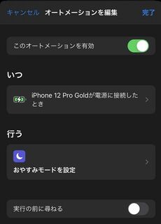 終了時間を入力する必要があるため、「オフ時」を選択。おやすみモード側で、終了時間を設定しておこう。これで、充電したときに自動でおやすみモードがオンになる。ただし、このオートメーションを適用すると、場所を問わずに充電しただけでおやすみモードがオンになってしまう。外出時にたまたまiPhoneを使いすぎて充電しただけでおやすみモードがオンになるので、運用には気をつけたい。