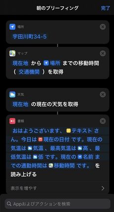 この中身を多少アレンジして、自分のショートカットに登録しておき、上記のようにアラームの停止とともに実行するように設定すれば、一通りの情報を1つのウィンドウ内にまとめた形で表示したり、情報を読み上げたりすることができる。ショートカットの操作に慣れたら、こちらを試してみてもいいだろう。