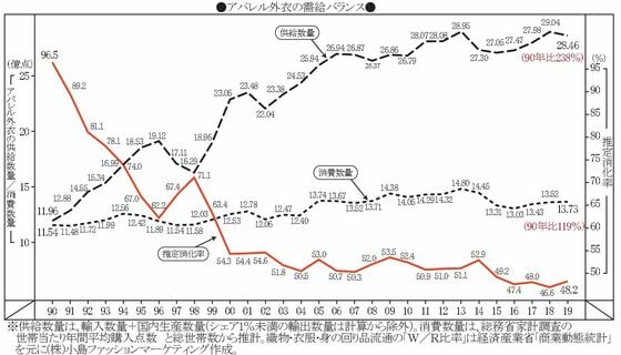 供給が急増したのはフリースブームでユニクロが台頭した直後の1999年からだ。1998年には71.1%が売れたのに供給量がわずか2年で41.5%も増加し、2000年には消化率が54.3%に落ち込んだ。ユニクロに対抗すべくアパレル業界が低価格を競って海外での大量生産を推し進めたのが直接の要因で、ユニクロがアパレル業界破滅の引き金を引いたと言っても過言ではあるまい。