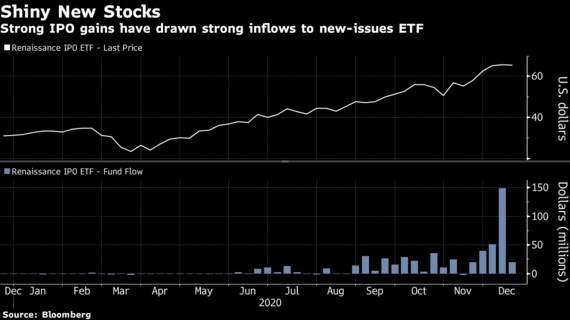 こうした中、新規上場株の動きに連動する上場投資信託(ETF)の「ルネサンスIPO・ETF」は空前の関心を集め、今年は2倍強に値上がりした。買収標的企業を発表していないSPACでさえも、今年は20%近い値上がりだとビスポーク・インベストメント・グループは指摘。「それが熱狂の兆候でないとしたら、何がそうなのか分からない」と同社アナリストらはリポートに記した。