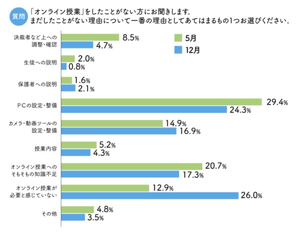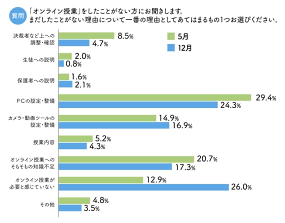 最後に、まだ「オンライン授業」をしたことがない回答者にその理由を聞いた結果を紹介しよう。注目したいのは、「オンライン授業が必要と感じていない」と答えた人が5月調査と比較し2倍以上に増えていることだ。